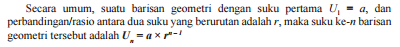deret geometri adalah deret dengan rasio antar 2 suku yang berurutan selalu tetap.
